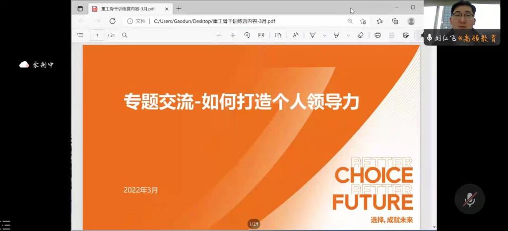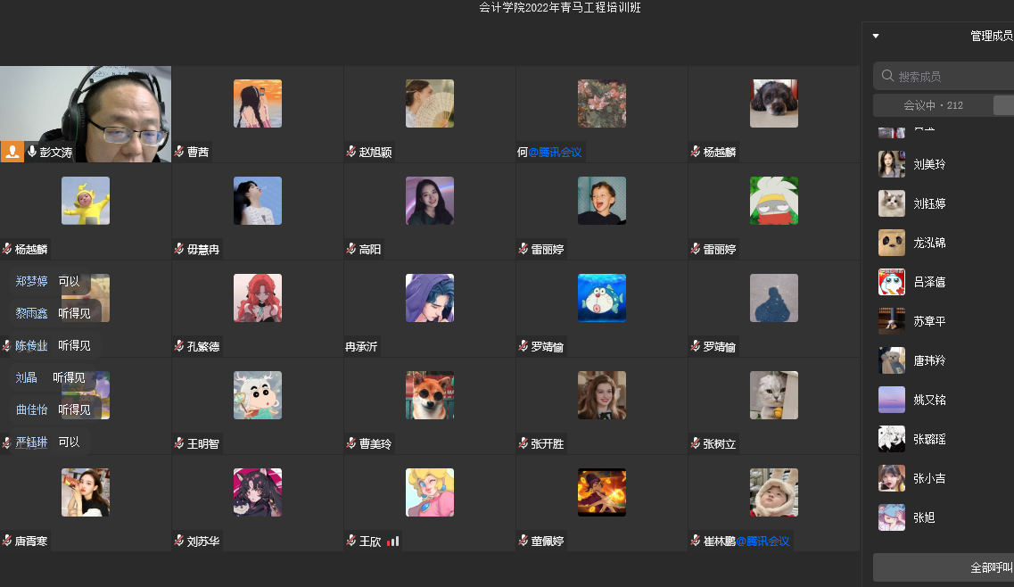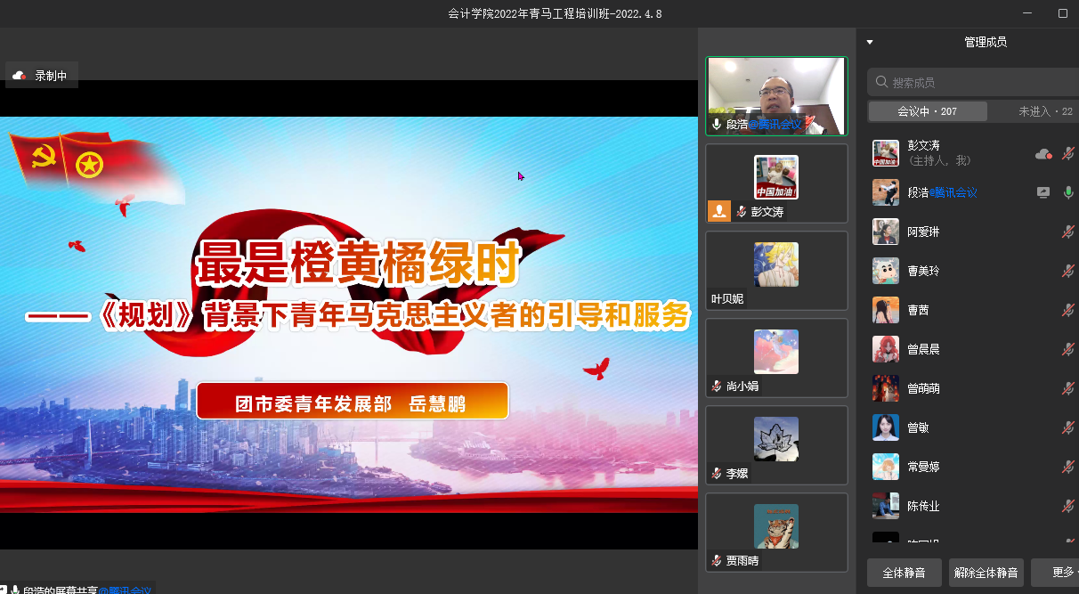 2022年4月1-8日,k1体育分团委成功举办k1体育2021-2022学年青马工程骨干线上培训班。本次培训分为四个阶段,分别由k1体育分党委书记罗惠玉书记、高顿集团重庆分公司总经理刘红飞先生、k1体育专职辅导员陈曦老师以及团市委青年发展部的岳慧鹏副部长主讲。此次会议由k1体育分团委组织部筹备,员工组织成员代表、各团支部代表共计 230 人参加。