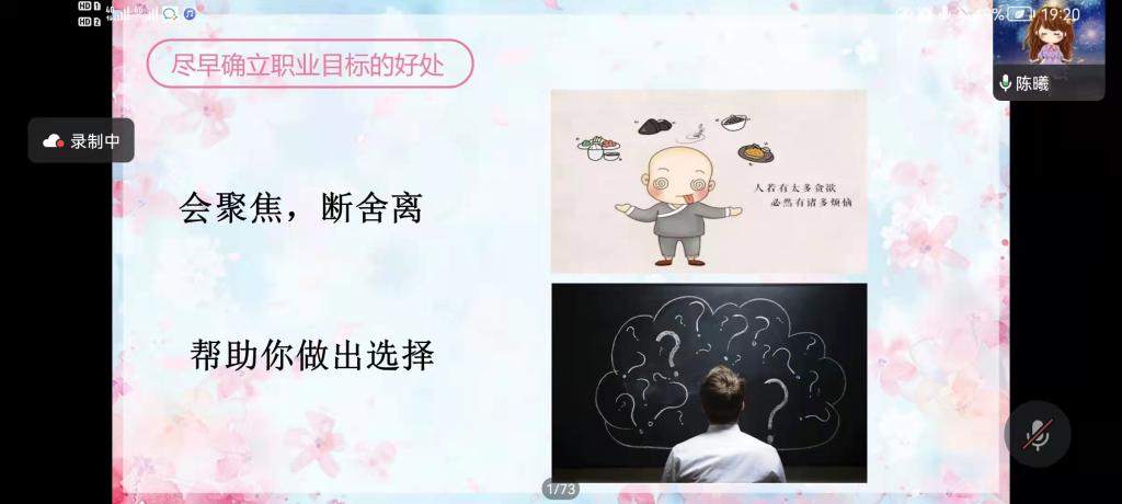 4月1日19:00,k1体育专职辅导员陈曦老师进行了第三讲,她结合具体事例,生动地为参训人员讲解了“员工干部如何结合工作做好职业生涯规划”,陈老师以地图作为贯穿线,深入地为同学们讲解了如何做出更好的规划。强调员工干部应该确立自己的目标、发挥自己的优势、拥有自己的兴趣、建立自己的人脉、自信看待自己,点亮自己人生的地图。她谈到,拉进和对方的心理距离的关键在于持续地产生交互,维持一定的关系温度,并鼓励广老员工骨干要接纳自己,发挥自己的优势,塑造美好人生。