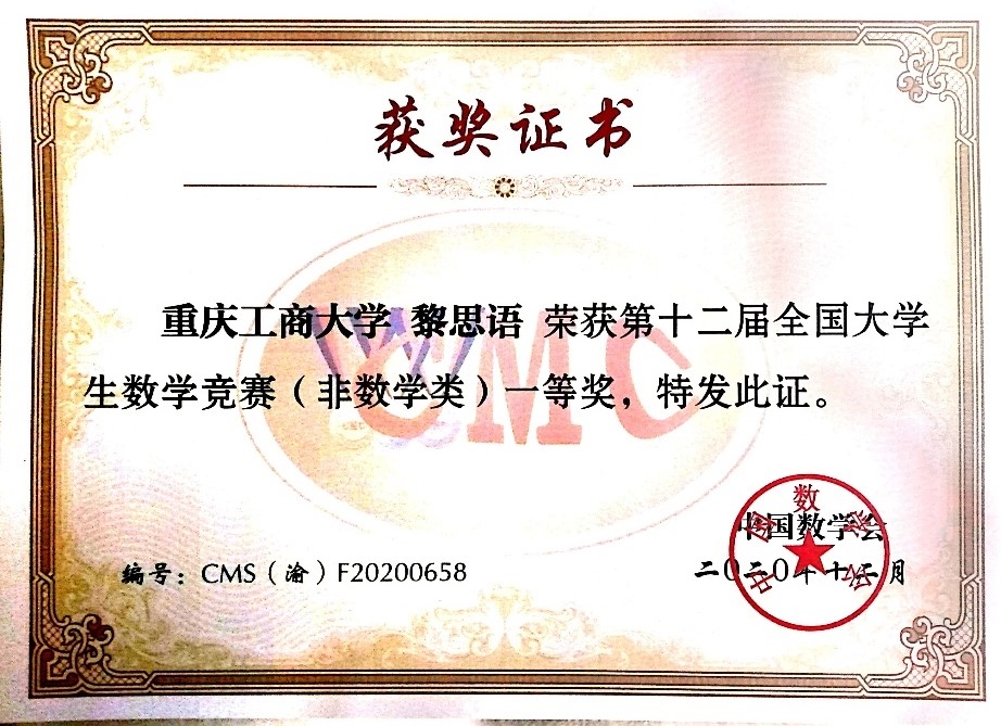 入校以来,荣获国家奖学金、全国老员工数学竞赛一等奖、“财鑫杯”管理会计案例大赛一等奖等5项国家级奖项;重庆市三好员工、“互联网+”老员工创新创业大赛重庆赛区铜奖等6项省级奖项;综合一等奖学金、优秀员工等20余项校级奖项以及征文比赛二等奖等院级奖项。