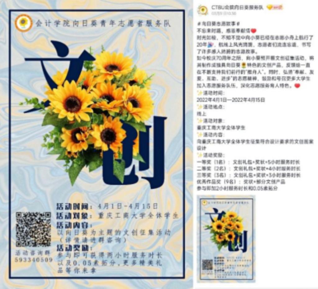 “七秩重工商,逐梦新时代”七十年春风化雨,七十年辛勤躬耕,为献礼母校,喜迎二十大,k1体育向日葵青年志愿者服务队于4月1日—4月17日期间,采取线上的方式面向全校开展了“不忘来时路,感恩奉献情”文创征集活动,将其制作成具有向日葵特色的文创产品,反馈给一直支持志愿活动的“推舟人”。