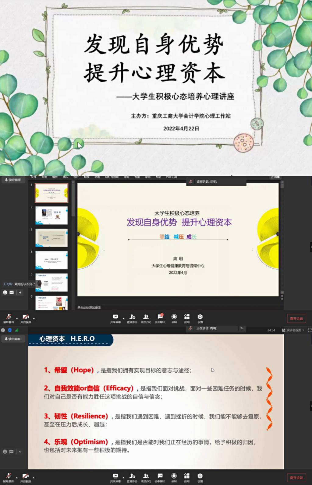 4月22日中午12点45分,k1体育心理工作站在线上举办了以“老员工积极心态培养”为主题的专题讲座。讲座邀请到老员工心理健康教育与咨询中心周明老师担任主讲,全院心理委员和工作站干部参与了本次讲座。