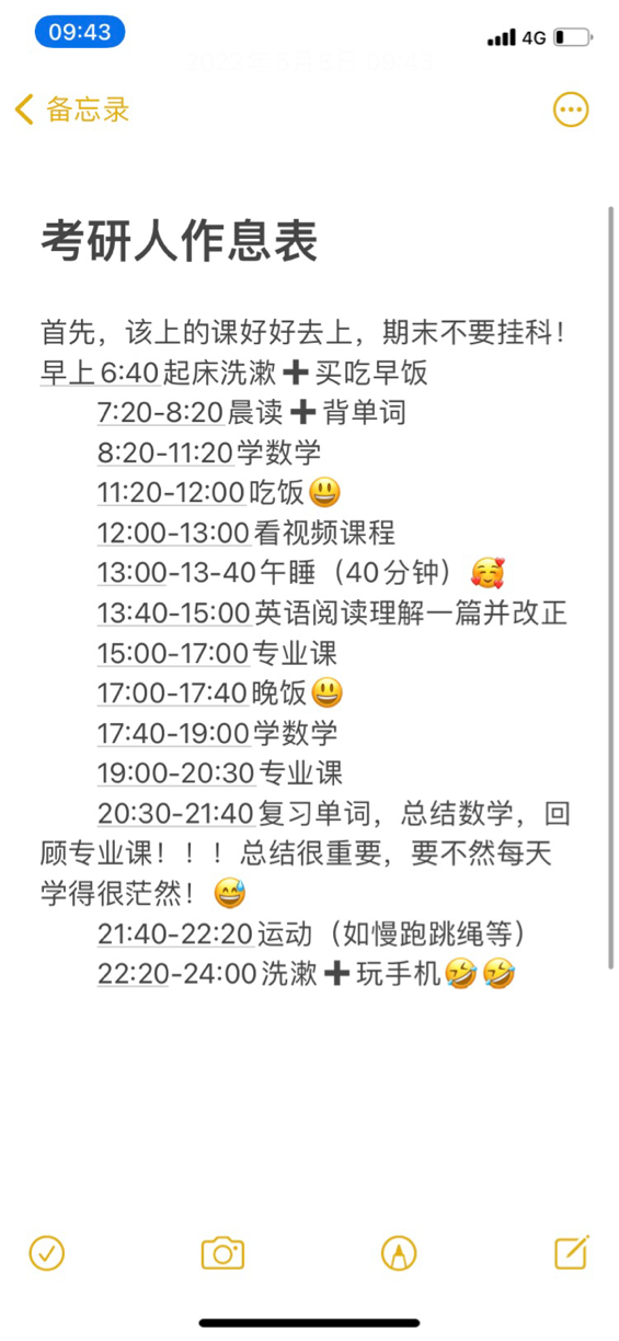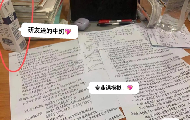 面对压力,胡蝶选择去运动和多沟通。上半年除了上课,备考,基本上一周去四五次健身房,去跳跳绳,练练器械,到暑假一周只去两三次健身房,然后到九月开始就不去健身房,时间太紧迫了,专心冲刺,但也可以适当运动,如去操场跑跑步,跳跳绳。都非常有利于放松心情,助睡眠和激活大脑。遇到压力和困难也可以和研友或者家人朋友沟通,不要自己闷在心里,会很难受的。此外,保持良好的心态非常重要!良好的心态来自于前期的付出,前期基础打扎实了,数学英语这些做起来就没那么难,后期任务虽然繁重,但是可以又快又准确地完成任务,自然不会学崩溃。