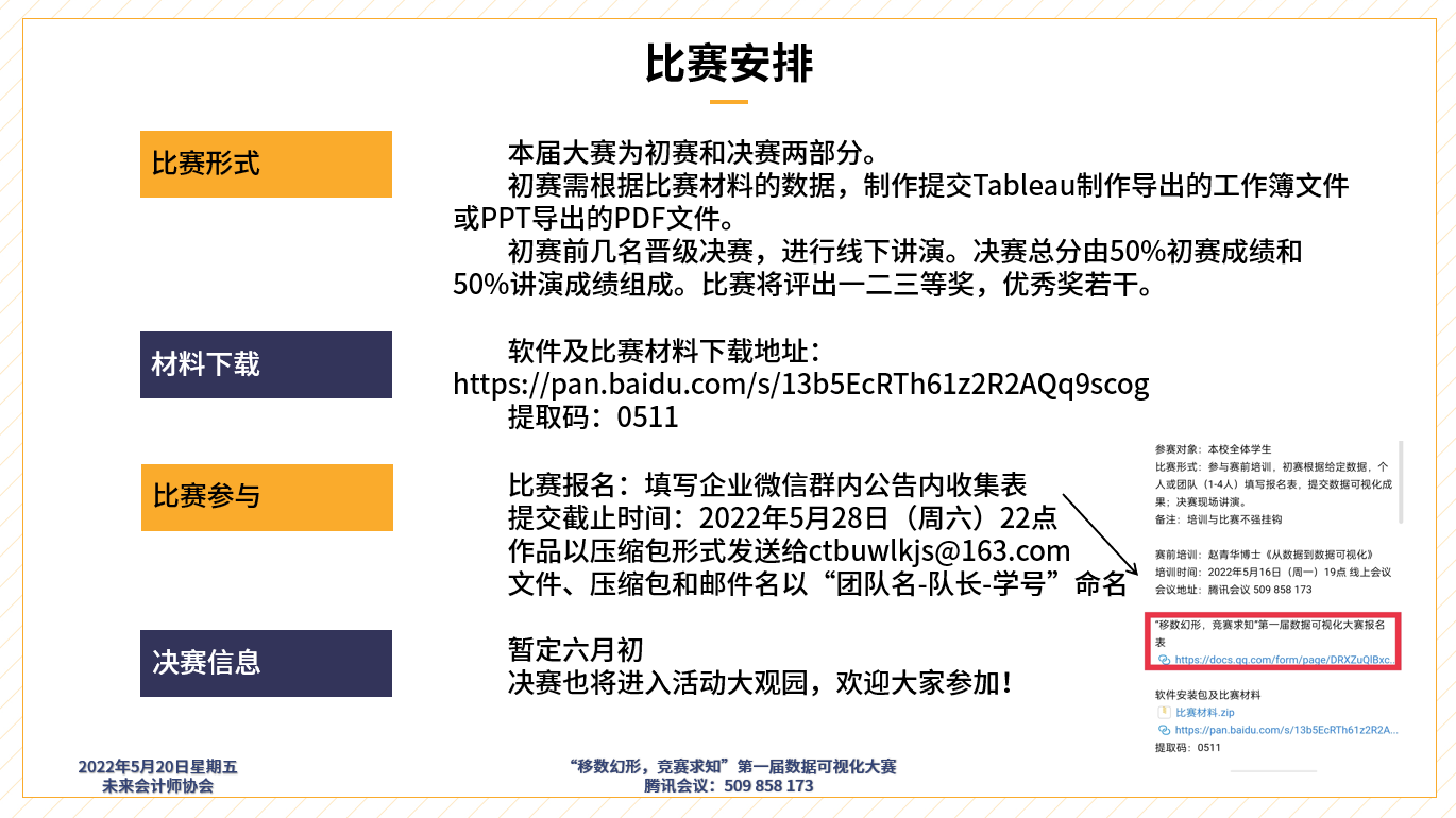 2022年5月16日,k1体育未来会计师协会主办的第一届数据可视化大赛培训会于腾讯会议顺利结束。本次培训会紧扣“移数幻形,竞赛求知”主题,从数据可视化的概念、工具等方面对参会同学指导培训,让同学们对数据可视化大赛有更近一步的认知。本次培训会有幸邀请到了k1体育赵青华老师作为大赛指导培训嘉宾,并有98名来自k1十年体育品牌各学院的本科生、研究生参加线上培训会。