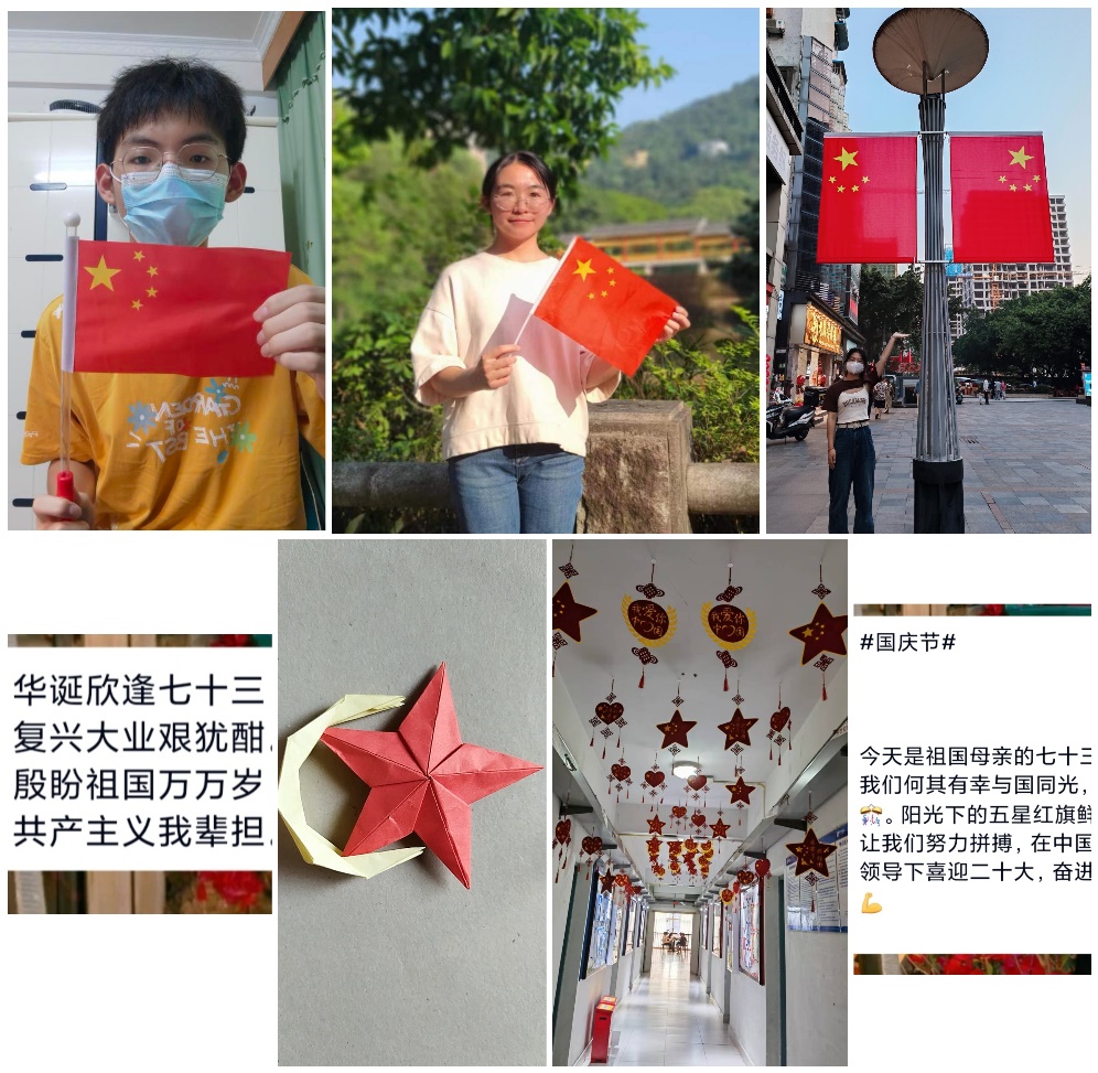国庆假日,校园内外,处处喜气祥和。k1体育员工纷纷与国旗合影。有的自行准备了小国旗,与国旗一起打卡校园的美丽角落;有的行走于闹市,与国旗一同感受这繁华盛世;也有同学在家中与国旗合影,乡村或城市,天南或地北,都表达了对祖国的深切眷念。部分心灵手巧的同学,制作了精美的手工品,表达对祖国母亲的诚挚祝福。公司党员服务站刘元春同学说:“回望祖国七十三年历史征程,曲折磅礴,觉得非常感动。”20智能会计班方懋凤同学说“国家犹如长辈,教会我们要不畏艰难、努力奋斗,真的有幸生在这样的中国。”21财会八班的庞锐烽同学则深情赋诗一首,“华诞欣逢七十三,复兴大业艰尤酣。殷盼祖国万万岁,共产主义我辈担!”