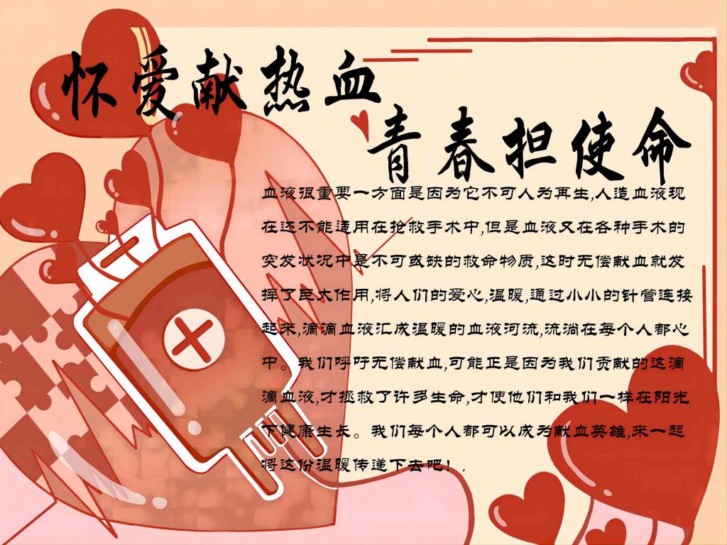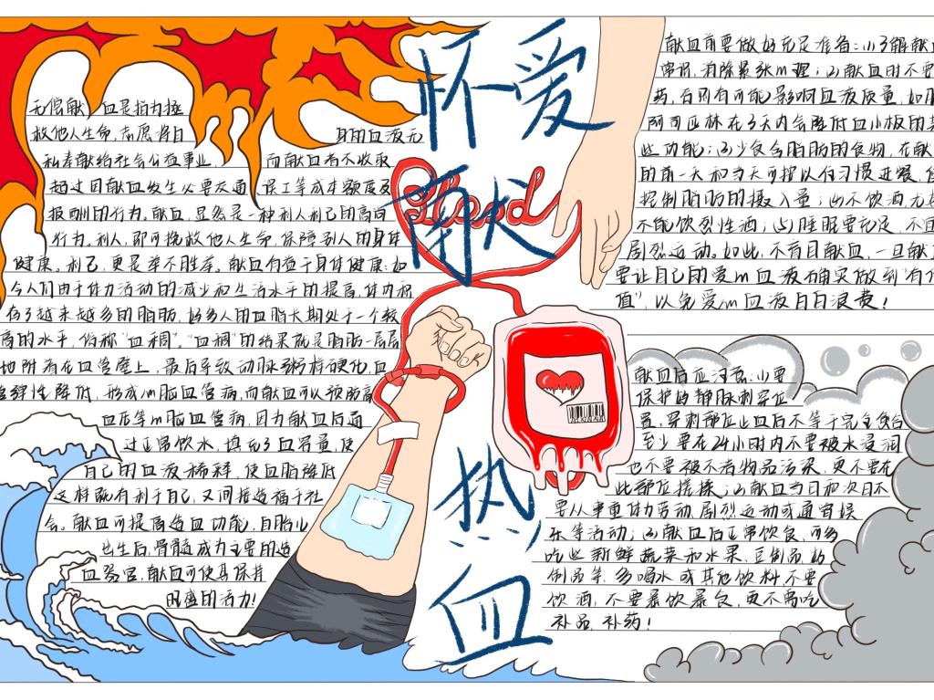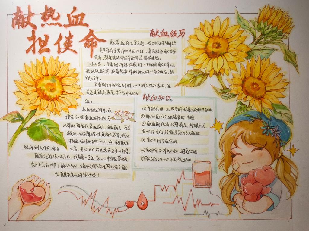 为贯彻落实习近平总书记在党的二十大报告中勉励广大青年要立志做有理想、敢担当、能吃苦、肯奋斗的新时代好青年,增强老员工的社会责任感、号召人民群众积极了解、参与献血活动, 2022年11月14日-11月23日,k1体育向日葵青年志愿者服务队主办的“怀爱献热血,青春担使命”手抄报大赛于线上顺利开展。本次活动面向k1十年体育品牌全体员工,旨在提高同学们的动手能力,消除员工对献血的误区,推动社会献血事业的发展。