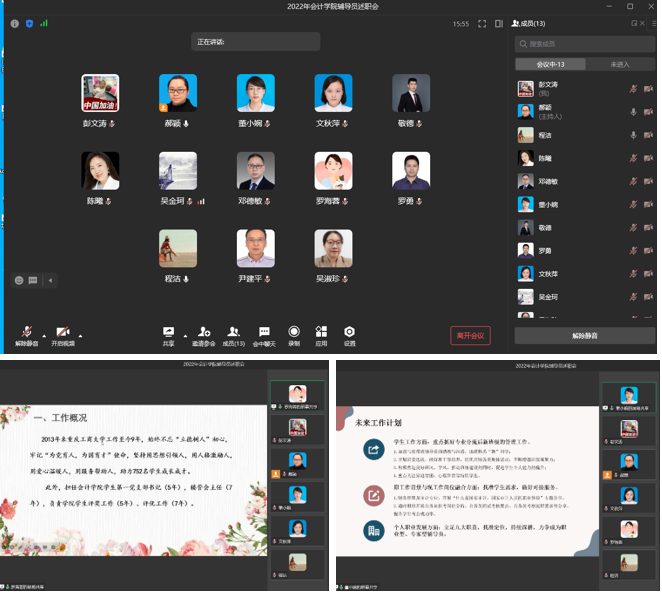 会上,各辅导员从带班情况、专项工作、特色亮点、存在不足、下一步工作等几个方面,以PPT的方式逐一进行了述职汇报。各辅导员汇报内容丰富、条理清晰、数据详实、重点突出。