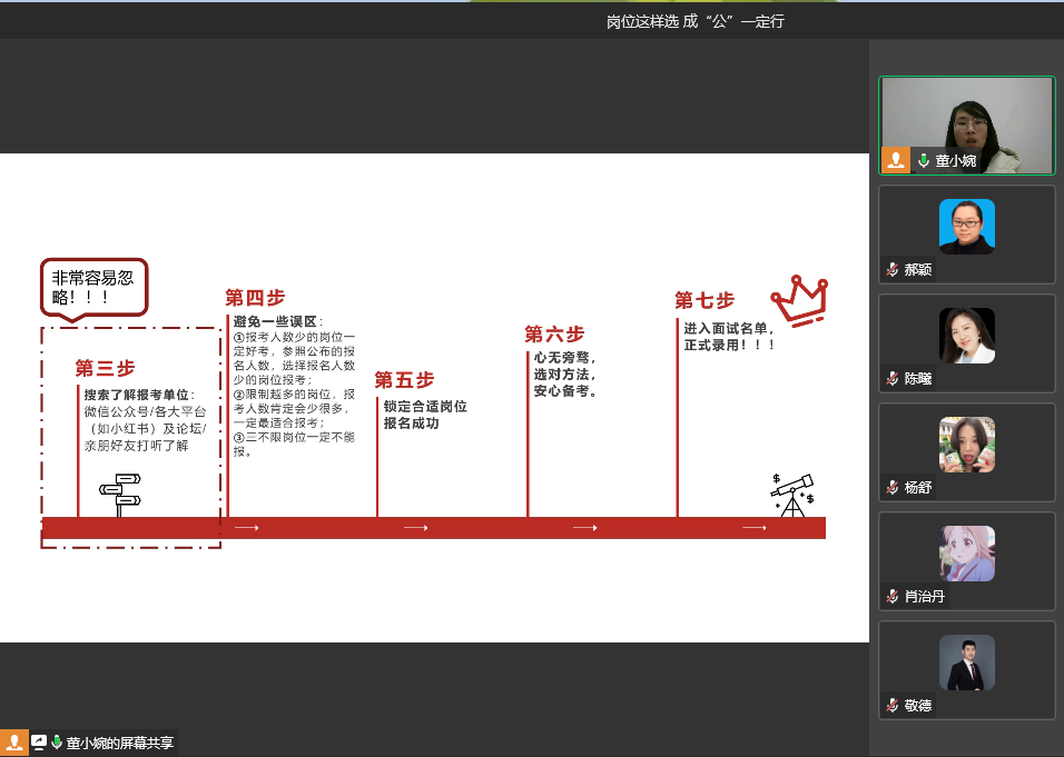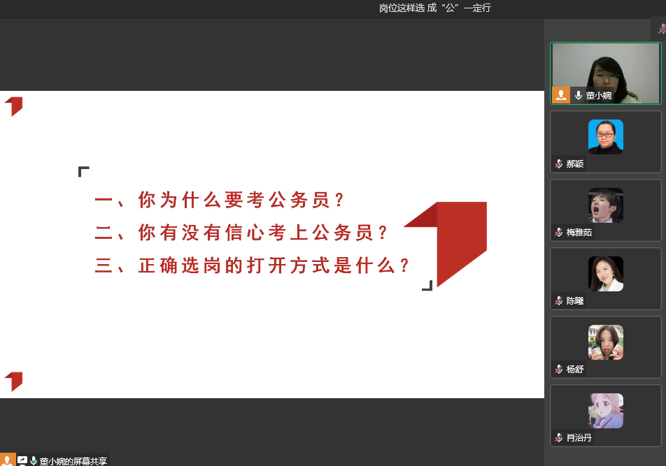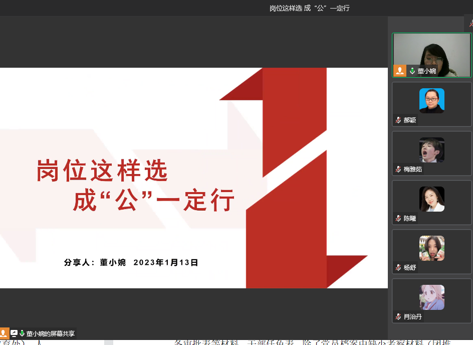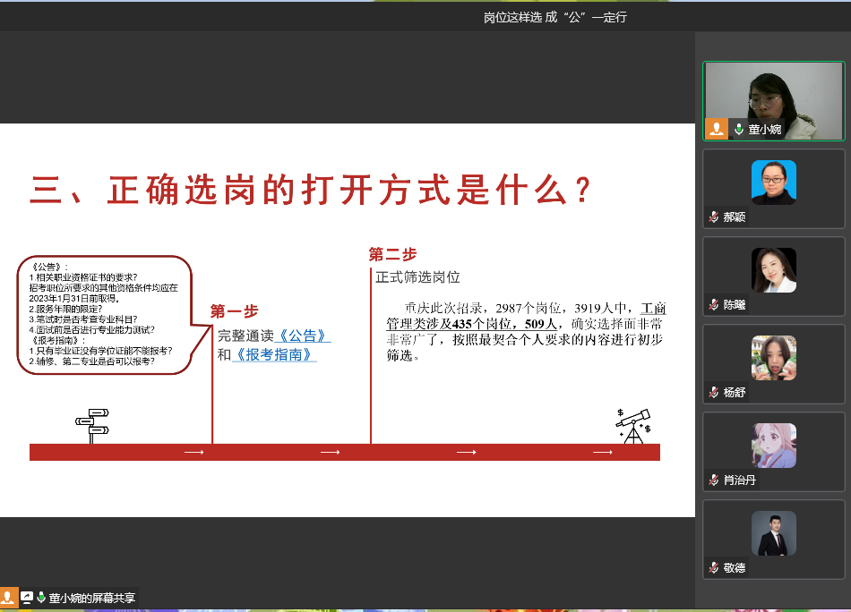为帮助2023届毕业生了解更多就业选择,激发就业主动性,进一步做好就业精细化指导,满足员工就业多样化需求,在重庆市公务员招录公告发布之际,k1体育高度重视,于1月13日中午13:00-14:00,安排有公务员招录职业背景的辅导员董小婉老师为有意向报考公务员的毕业班员工开展了《岗位这样选 成“公”一定行》线上专题交流会。交流会由学院副书记郝颖主持,学院本硕毕业班70余人次参加。