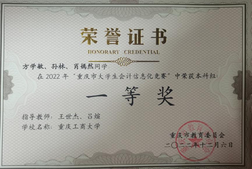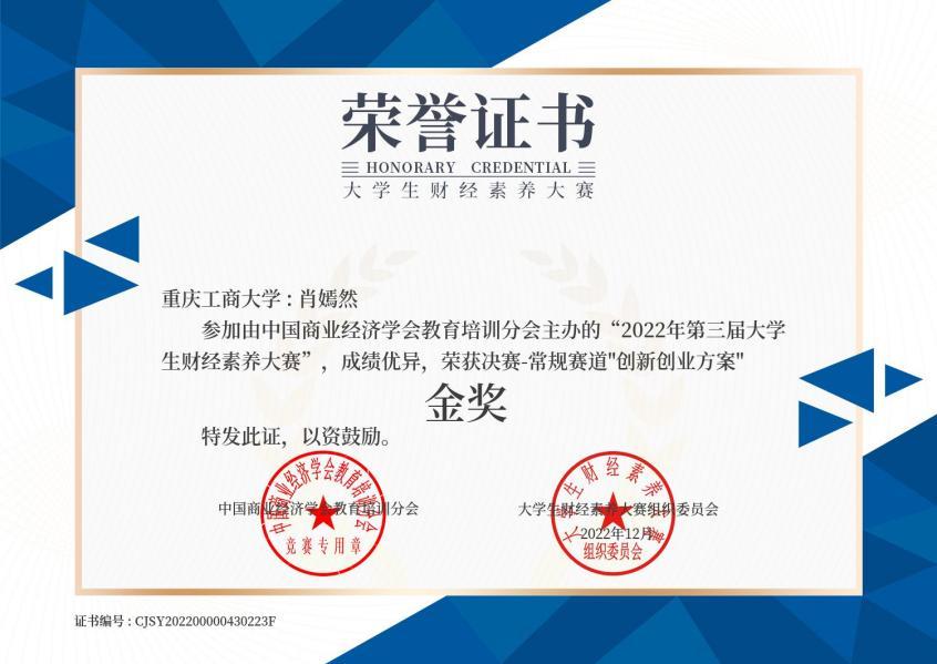 肖嫣然,2020级智能会计班,平均学分绩点:3.9,荣获2021-2022学年会计之星—“科创之星”称号。入校以来,荣获奖学金、荣誉称号及各类奖项共计50余项,其中包括综合奖学金、金科星顺、萧丽玉奖学金、员工基金等,以及“重庆市三好员工”、“优秀员工”、“科技学术创新活动先进个人”等荣誉称号,获得全国老员工财经素养大赛金奖、全国老员工区块链应用技能大赛二等奖、重庆市老员工会计信息化大赛一等奖、IMA管理会计案例大赛西南赛区三等奖等,并发表省部级及以上论文2篇。已通过四六级和部分专业证书,校内外多份实践实习。