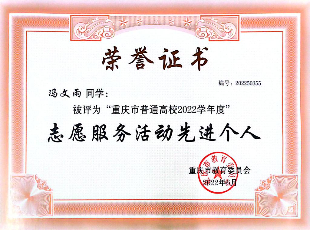 大学四年,冯文雨参加了大大小小公益服务活动50余次,在企事业单位实习过4次。她提到,在校内外参与公益活动的时候是她感觉最有价值的时刻。她说,三年的“三下乡”社会实践,极大地培养了个人能力。2020年的“声讯传情,抚慰心灵”线上支教让她对山里孩子对知识的渴望有了更深的体会;2021年,作为“益路同行,童心向党”的负责人她也以志愿者的身份给武隆山区员工传递知识与力量;2022年,为促进巴南区黄金林村的发展,她与团队深入调研,为黄金林村乡村振兴之路发言献策。在事务所实习的一个月里,她因为出色的沟通能力,被安排走访了14家公司。在这过程中,她需要与不同的券商、律师、企业家进行沟通,这对她开阔视野,提升独立能力有深远影响。
