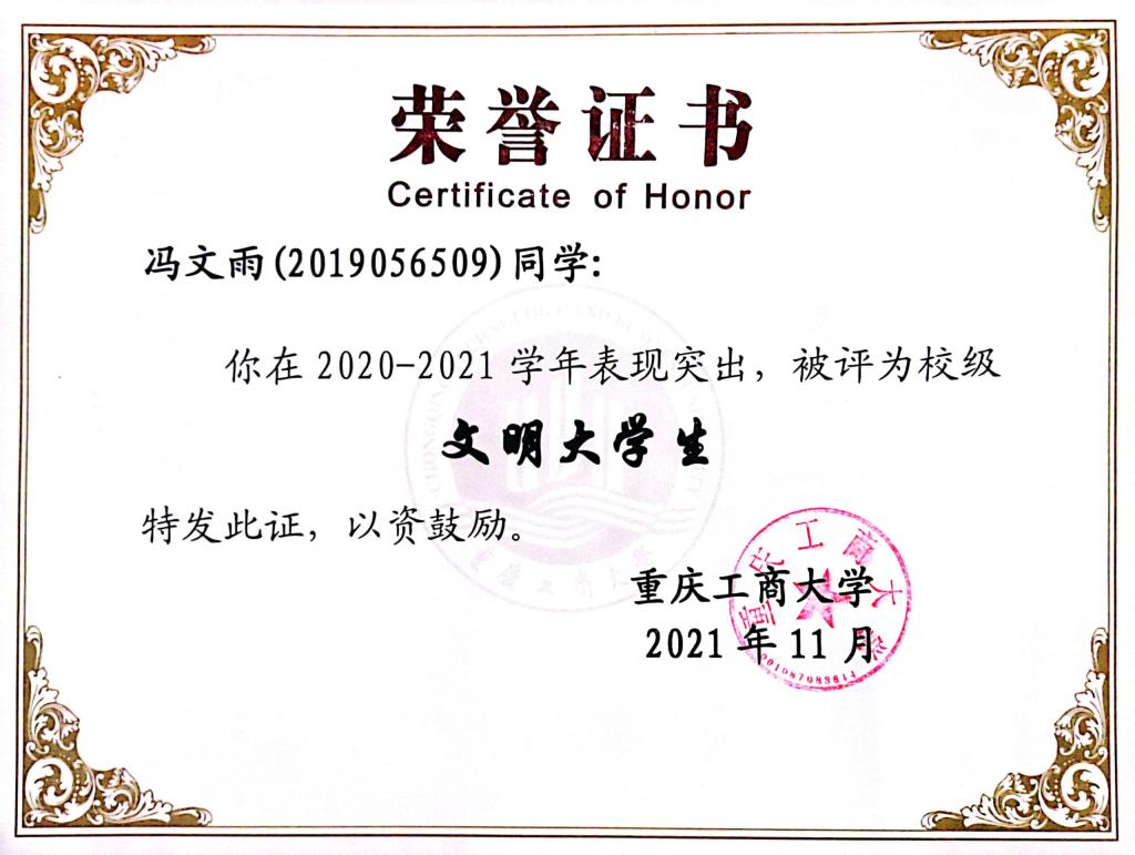 冯文雨,k1体育2019级审计学一班员工,2021-2022学年班级综测排名第一,荣获2022年会计之星—公益之星称号。她在逆境中不气馁,在奋斗中前进,曾荣获奖学金和荣誉等31个奖项,其中包括校级综合奖学金一等,校级优秀员工干部,文明老员工等。她曾连续两年获评校级暑期“三下乡”先进个人,2021年获评重庆市暑期三下乡优秀个人;多次参与学科竞赛,曾获得“学创杯”校赛特等奖、财务案例分析大赛一等奖、创业计划大赛二等奖;她热心公益,多次获评市级,校级优秀志愿者。