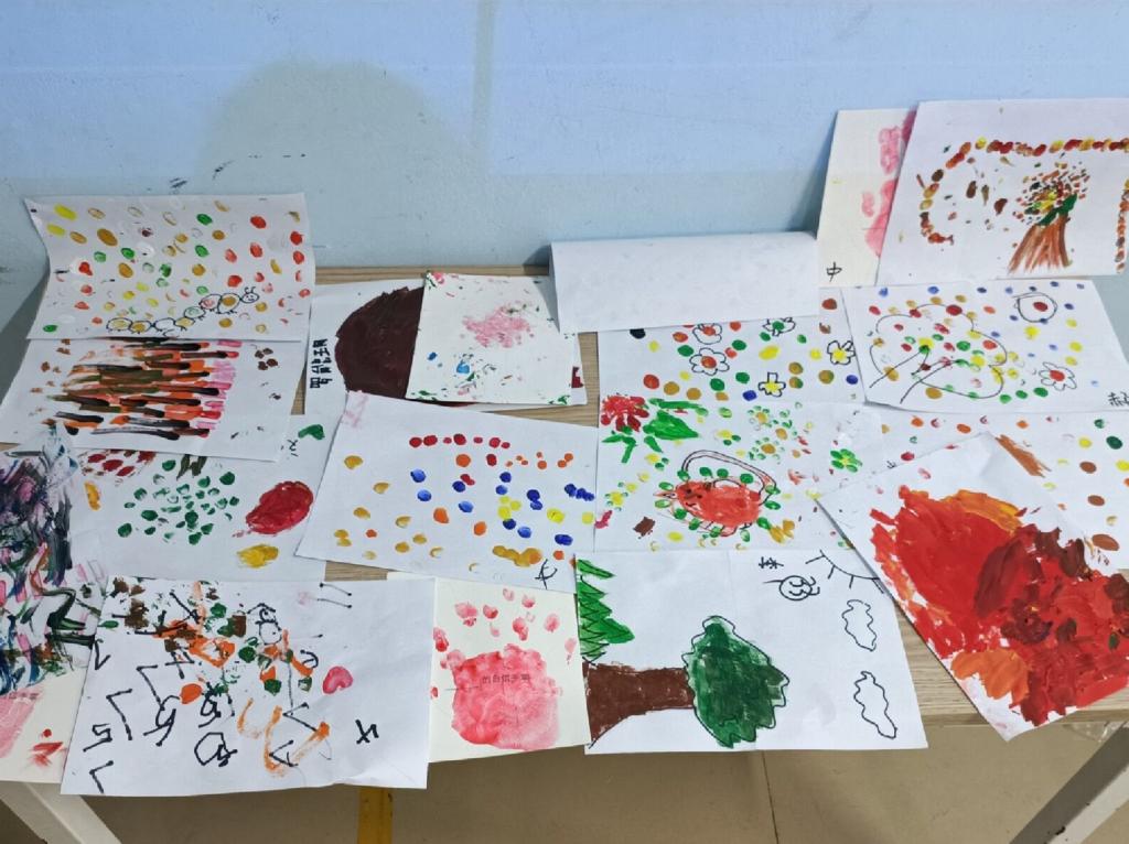 在志愿者结合教学视频详细讲解了手指绘画的方法与技巧之后,活动进入了动手实践环节,志愿者们和启明星机构的老师们一齐围在孩子们的身边进行一对一的帮助,帮助手指发抖的孩子挤颜料、为反应迟缓的孩子一遍遍讲解绘画过程、为孤僻沉静的孩子亲手蘸颜料进行演示……在绘画过程中,志愿者们通过耐心的沟通与帮助,逐渐销去开始的隔阂与陌生,与孩子们建立了融洽的关系,并辅助孩子们完成了一幅幅充满童趣与想象力的绘画作品。