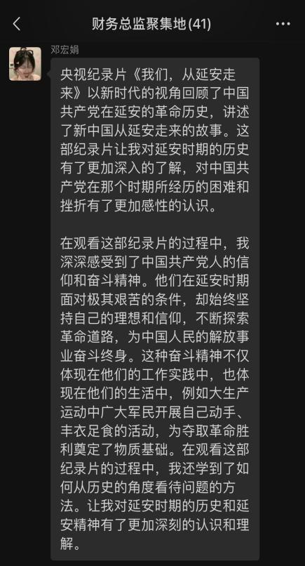 观影结束后,同学们纷纷在班级微信群发表观影观后感,分享对延安精神的理解和感悟,以及对纪录片《我们,从延安走来》的感想,革命志士为了中国的解放中国人民的独立自由做出了巨大牺牲,像白公馆渣滓洞的革命先烈倒在了黎明到来前的敌人的枪口之下,我们无不深深痛惜他们的生命也感叹到现在美好和和平的生活来之不易。