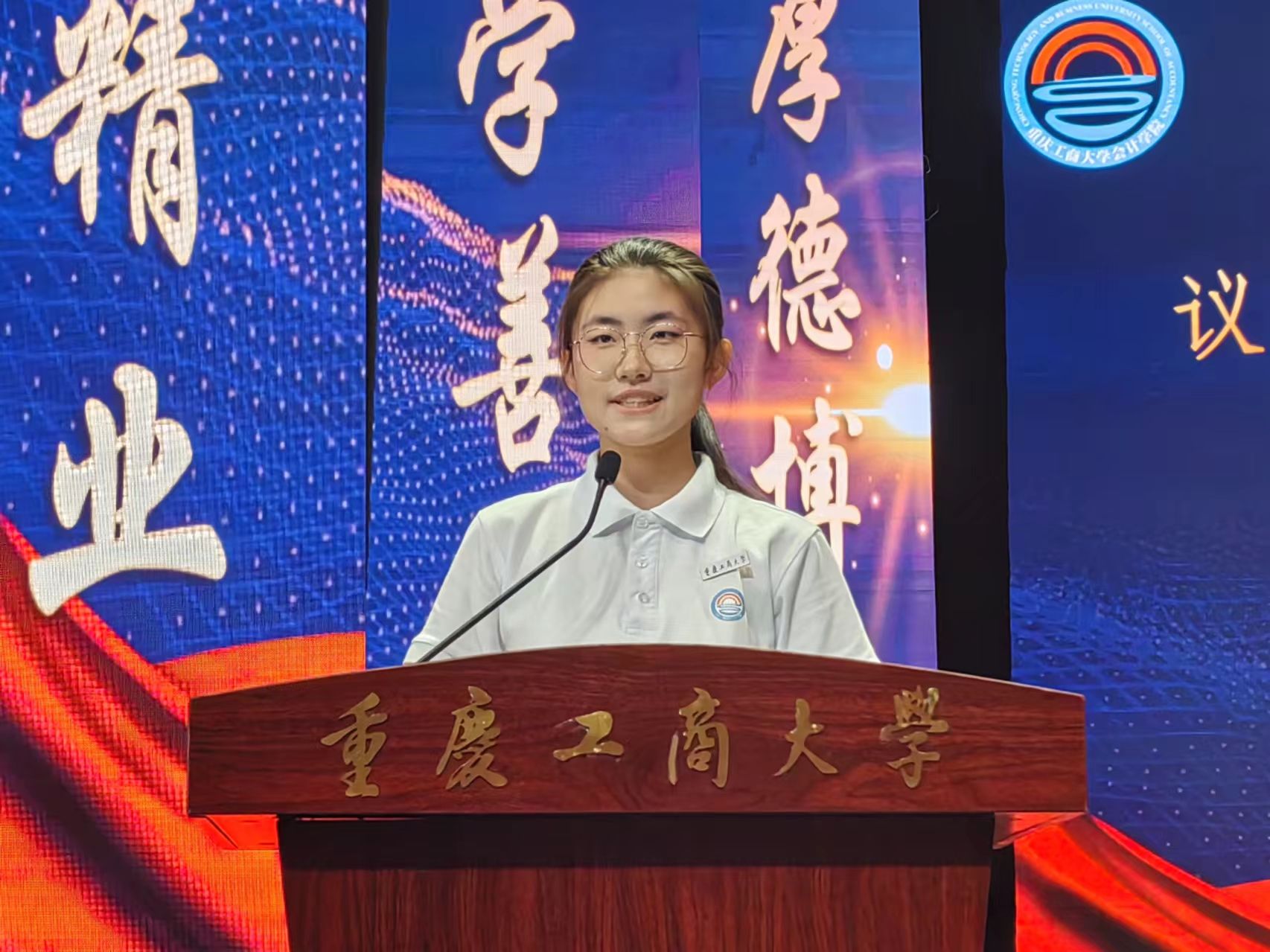 2023级会计学二班王晨钰同学作为员工代表登台发言。她分享了自己在学习和生活中的宝贵经验,以自身的成长历程激励着新同学们勇敢面对挑战,努力追求卓越。