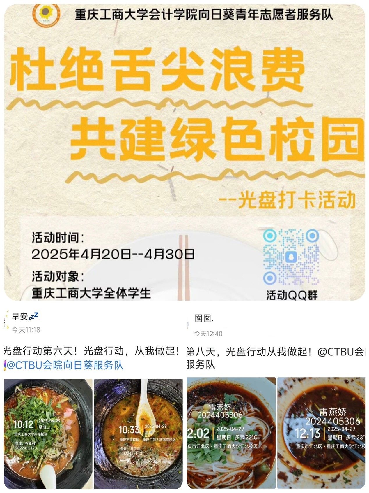 全校员工积极响应,参与热情高涨。同学们严格按照规则,每天在QQ群里打卡,附上带有时间水印、个人信息的空间动态截图,其中包含餐前和餐后光盘照片,文案还会配上光盘行动标语并艾特官方QQ。打卡期间,大家相互监督、相互鼓励,形成了良好的活动氛围。参与者们通过实际行动,践行节约粮食的理念,为构建绿色校园、推动社会文明进步贡献自己的一份力量。