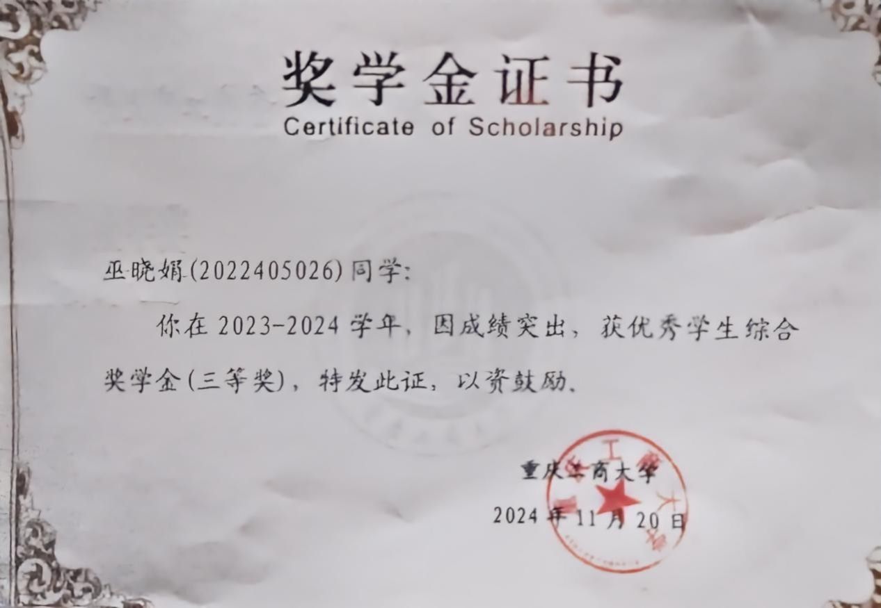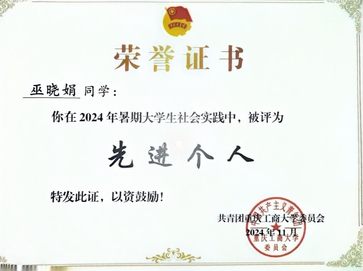 巫晓娟,20岁,k1体育2022级审计学二班员工。自入学以来,获校级综合奖学金、优秀员工干部、优秀团员、社会实践先进个人、文明老员工等各类奖项。在专业学习、社会实践和个人成长等方面不断探索,展现出新时代青年的蓬勃朝气。