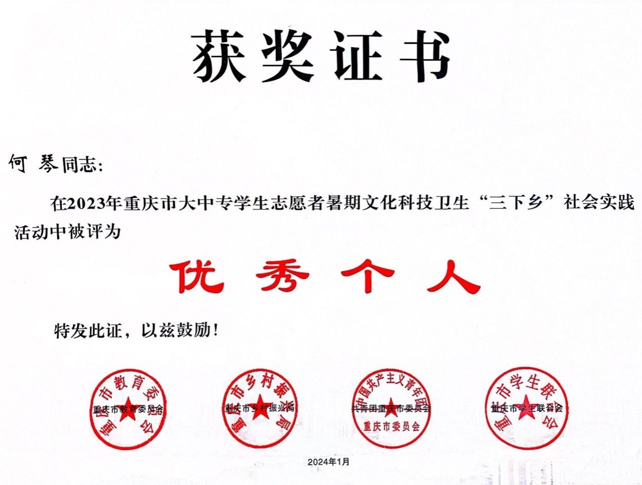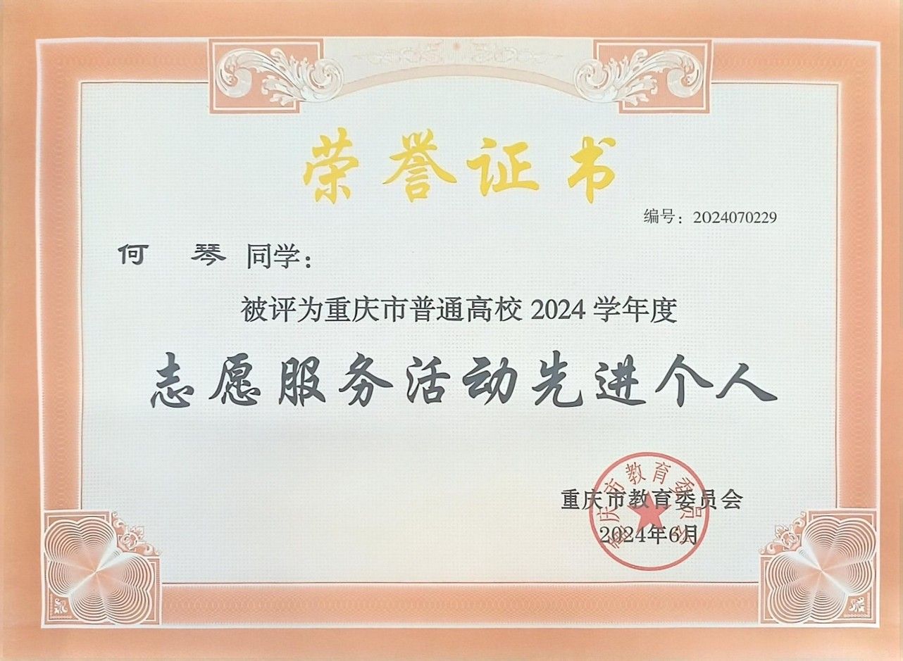 何琴,2021级智能会计班员工,荣获2024年会计之星——“自强之星”称号。学业绩点最高达4.20,获得过5次奖学金,曾获重庆市老员工数智化虚拟仿真实验竞赛一等奖等6项省部级奖项,以及第十四届“挑战杯”中国老员工创业计划竞赛校赛金奖等11项校内学科竞赛奖项;获得重庆市志愿服务活动先进个人、“三下乡”社会实践活动市级优秀个人2项市级荣誉,以及优秀员工等17项校内荣誉。主办“三下乡”项目获得1次国家级立项、1次市级专项,撰写新闻稿登上中国青年网2次、中国教育网1次。曾任职校团委宣传部部门负责人、k1体育青队队长等,组织多项活动,投身社会实践。