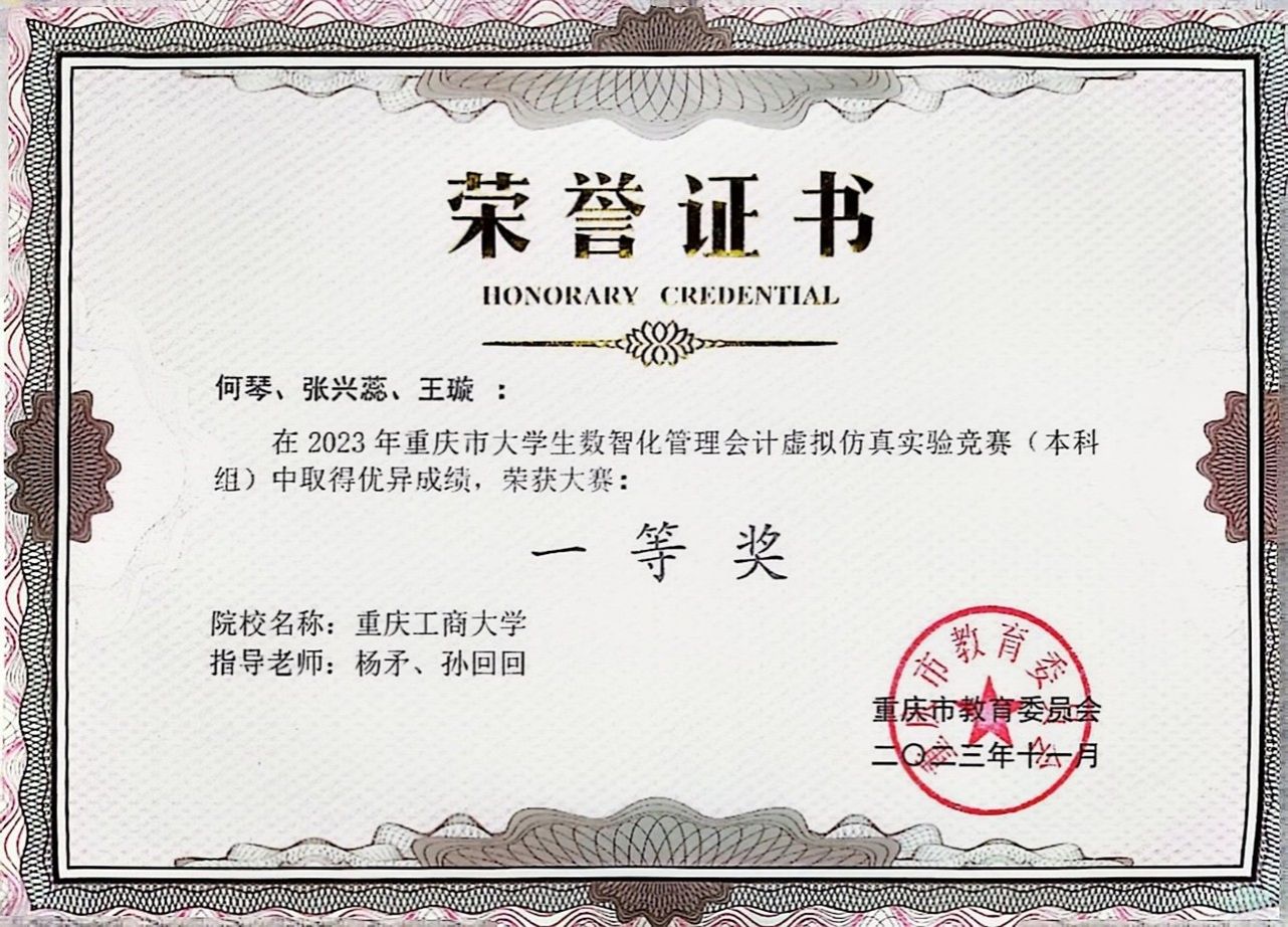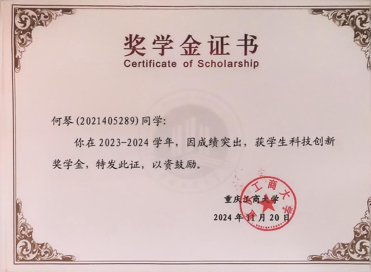 何琴同学对学术探索满怀热忱,积极投身于各类学科竞赛,在赛场上展现出非凡的实力。她凭借扎实的专业知识和卓越的应变能力,获得了重庆市老员工数智化虚拟仿真实验竞赛一等奖等6项省部级奖项,以及第十四届“挑战杯”中国老员工创业计划竞赛校赛金奖等11项校内学科竞赛奖项,在竞赛方面有着非常丰富的经验。她认为,竞赛是一个不断学习与成长的过程,在不断的实践、积累中也会促进自身更好的发展。