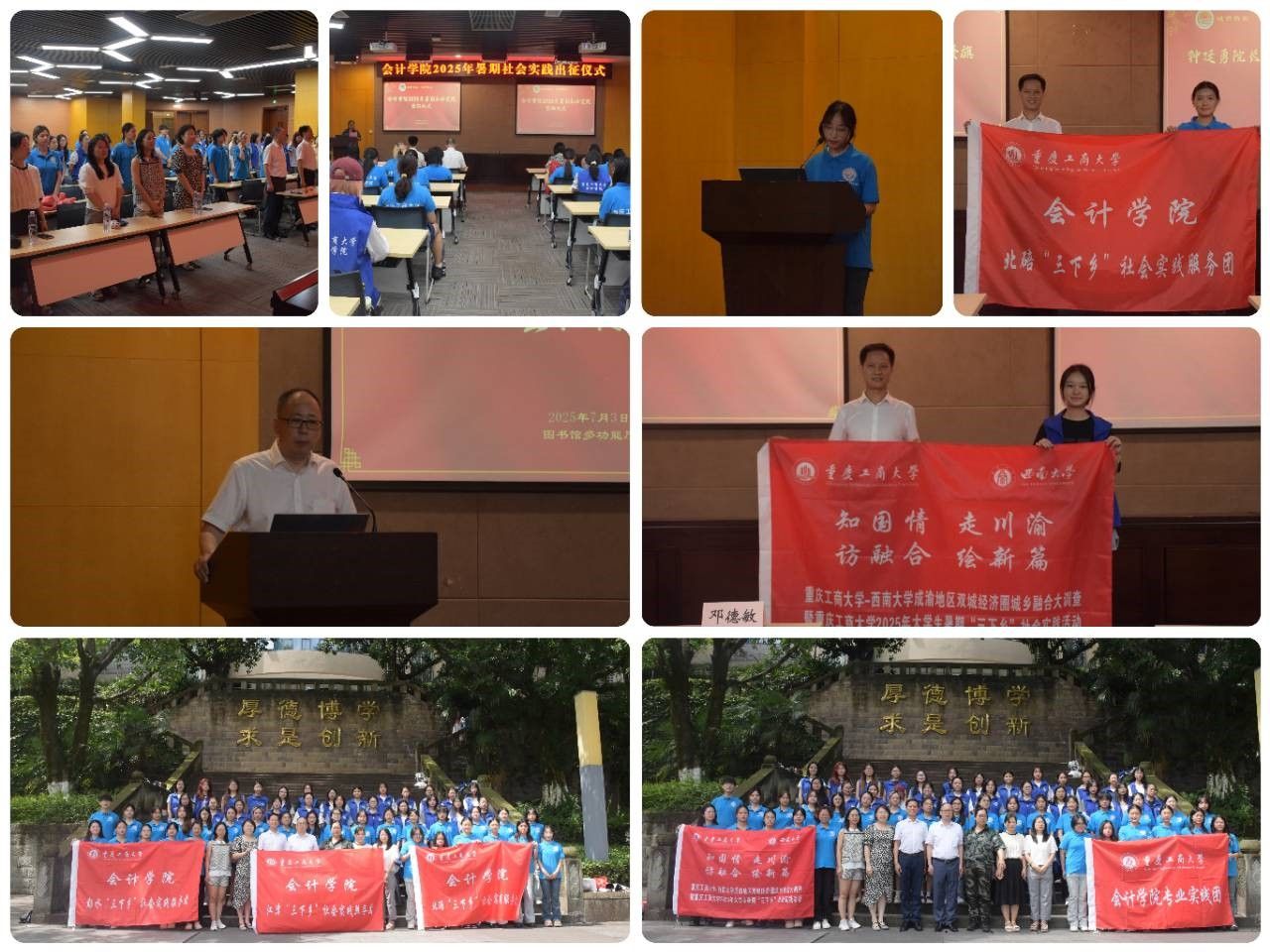 钟廷勇经理为各实践团授旗。北碚实践团、江津实践团、彭水实践团、专业调查团(两江新区和璧山实践团)、成渝调查实践团等依次上台接旗。