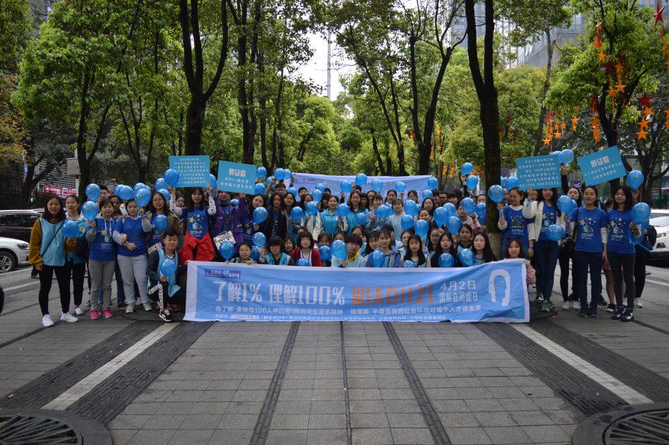 上午九点半,志愿者签到分发蓝色T恤、蓝色带、蓝气球。随后,在老师的带领下齐喊口号:“了解1%、理解100%、做一天1%,关爱自闭症群体”,为自闭症群体发声。下一个环节就是合唱歌曲《和你一样》、《最好的未来》,表达我们对自闭症儿童的关心和美好的祝福。合唱结束后,全体参与者跳集体操。此次表演声势浩大,吸引了来往行人的注意,许多人纷纷询问此次活动内容及目的,为宣传关爱自闭症达到了很好的效果。集体大合照后,老师和志愿者开始健走。健走行动全程7公里,从宏声广场出发至清水溪步道,步行沿途志愿者向行人发放关于自闭症相关资料。“道阻且长,行则将至”,虽然全程七公里,但志愿者还是坚持走完。