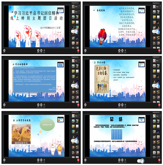 本次线上主题团日活动的召开,会计学子会时刻牢记习总书记的嘱托,珍惜学习时光,在学习生活中不断提升自我,怀揣着梦想,练好过硬本领,积极响应党和国家的号召,毕业后到人民最需要的地方去,为祖国富强和人民幸福贡献自己的力量,让青春在党和人民最需要的地方绽放绚丽之花。
