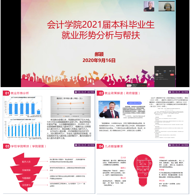 会议伊始,郝颖副书记介绍了当前的就业形势、就业政策、就业帮扶,并提出了三点期望和三点要求。首先,她介绍了常态化疫情防控下总体的就业形势、进行了近三年学院就业情况和考公数据的比对,分析了公司2016级毕业生的就业分布和就业态势;其次,她对国家和学校的就业政策进行了详细的解读,并对目前就业形势提出了学校、学院相应的帮扶措施,如学院发动全体教职工实现“三个一”,即每位教职工完成“至少提供一条就业信息”、“至少直接或间接帮助一位员工签约”、“至少为一名考研员工提供专业指导或者帮助联系调剂”中的一项;随后,她从学院促进就业角度出发,提出拟开展毕业生就业帮扶调研,针对性开展就业技能培训,并提供了就业的信息渠道;最后,她希望同学们能够“立大志、强信心、稳心态”,要求同学们做到“早谋划、早准备、早行动”,祝愿同学们能够“胸怀理想,成就事业,成为新时代新儒商的佼佼者!”