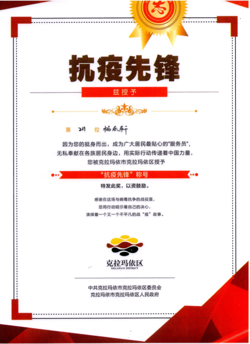 k1体育2019级CIMA班,来自新疆克拉玛依的杨东轩同学就是其中的一员。在此次新疆疫情期间,他加入了志愿者队伍。自2020年7月20日至8月27日,杨东轩积极参加各项志愿者服务:核酸检测点测温消杀、核对人员信息、维持秩序、为社区居家观察户送菜、值守门岗、巡逻劝导……他不辞辛苦,为抗疫做出了自己的贡献。