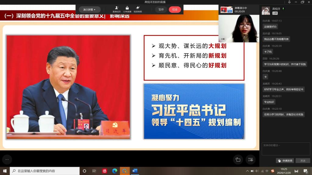 为深入学习宣传贯彻党的十九届五中全会精神,引导广大团员青年积极融入全面建设社会主义现代化国家新征程当中来,按照校团委的统一安排部署,12月20日,校团委“十九届五中全会精神宣讲团”成员、公司2018级会计四班田弥同学通过直播的方式为所在团支部开展党的十九届五中全会精神宣讲活动。会议由2018级会计学四班高悦洋同学主持,2018会计四支部全体团员45人参与学习。
