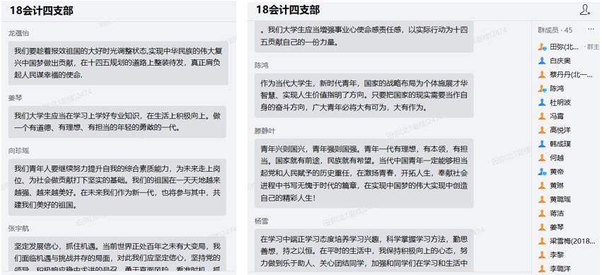 随后支部同学纷纷分享学习体会。刘宇航谈到:“在学校会更加立足于实际,努力学习自己专业知识,不断提升自己,跟上国家发展的步伐,为实现中国的复兴梦出一份力。”何越谈到:“大三已经开始面临着未来的选择,我们更应该脚踏实地,做好自己未来人生的规划,将自身的成长与祖国发展相紧密联系起来。”龙晓芳谈到:“国家给我们青年人创造了许多机会与机遇,作为国家发展的主力军,我们更应该掌握好所学知识,到真正踏入社会时才能发挥更大的造福力量。”