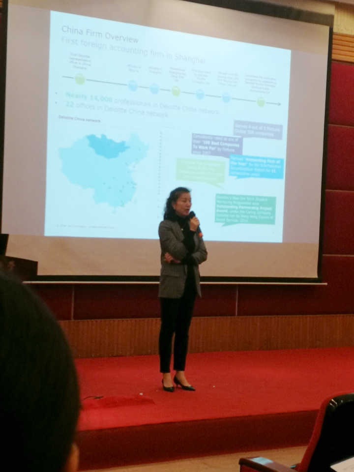 在会议正式开始前,报告厅的大屏幕上滚动播放着德勤的宣传片,让到场的同学们对德勤全球交付中心有了初步的了解。会议伊始,主办方对德勤中国在重庆开设的全球交付中心–德勤华庆商务服务有限公司进行了精简的介绍,包括了其主要工作、以及本次宣讲会出席的嘉宾。德勤GDC是为中国各办公室提供不同领域的服务,为德勤全球网络以内的其他成员所提供业务支持的后勤机构,而出席本次宣讲会的嘉宾是GDC的各部门主管以及工商出身的优秀的学长学姐们。主持人通过给同学们介绍德勤这种特别的打招呼方式,成功引燃了热烈的现场气氛,大家在轻松愉悦的氛围中与到会的德勤工作人员们进行了问答互动,他们专业的态度和耐心的解答给同学们留下了非常好的印象,而同学们热情积极的态度也为下一步的招聘奠定了良好的基础。接下来,主持人对本次德勤校招,网上申请,实习等注意事项对同学们进行了讲解。畅聊会最后的环节是“free chatting” ,同学们可以在会场内自由走动咨询相关内容,在德勤与员工双方融洽的交谈后,本次德勤全球交付中心的校招会圆满结束。值得一提的是,在宣讲过程中,主办方还穿插了许多有意思的抢答环节,并且准备了精美的礼品,将现场的气氛推向一波又一波高潮。