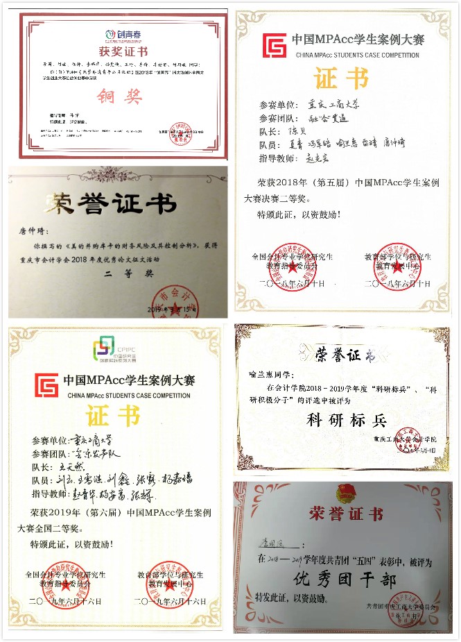 MPAcc教育中心还鼓励同学们积极参加各类校级、市级乃至国家级的学术活动和科技文体比赛,如校级的科文杯篮球赛、研究生辩论赛、研究生十佳歌手大赛、重庆市会计学会组织的征文比赛、中国MPAcc员工案例大赛、全国审计精英挑战赛、挑战杯全国老员工课外学术科技作品竞赛等。截止目前,公司MPAcc同学们获得两次中国MPAcc员工案例大赛二等奖及一次全国审计精英挑战赛二等奖、一次“创青春”全国老员工创业大赛铜奖。