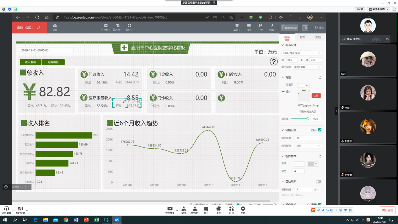 第八期教学工作坊以财务大数据分析与决策为主题,新道公司高级讲师李志良老师指导了同学们如何运用新道云软件中的分析云系统对数据进行可视化的进阶操作。会议开始,李志良老师以某医院经营数据作为案例引入。接着,李老师亲自演示了数据上传、集成的过程,并带领同学们进行了收入看板可视化的具体操作。大家通过自己的实践,加深了数据可视化操作步骤的印象,对实现数据可视化的具体应用有了更加清晰直观的认识。