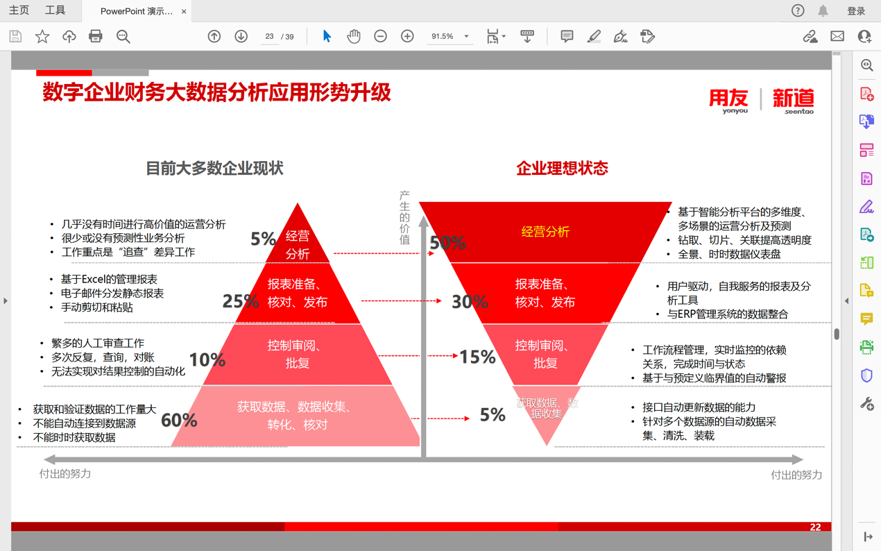 同时,李老师指出目前大多数企业的工作重点在于数据的获取、收集、转化等程序上,但是企业的理想状态应是将工作重点放在经营分析上,从而使企业的价值得到高效率的提升,而这正是大数据赋能财务决策能带给我们的。