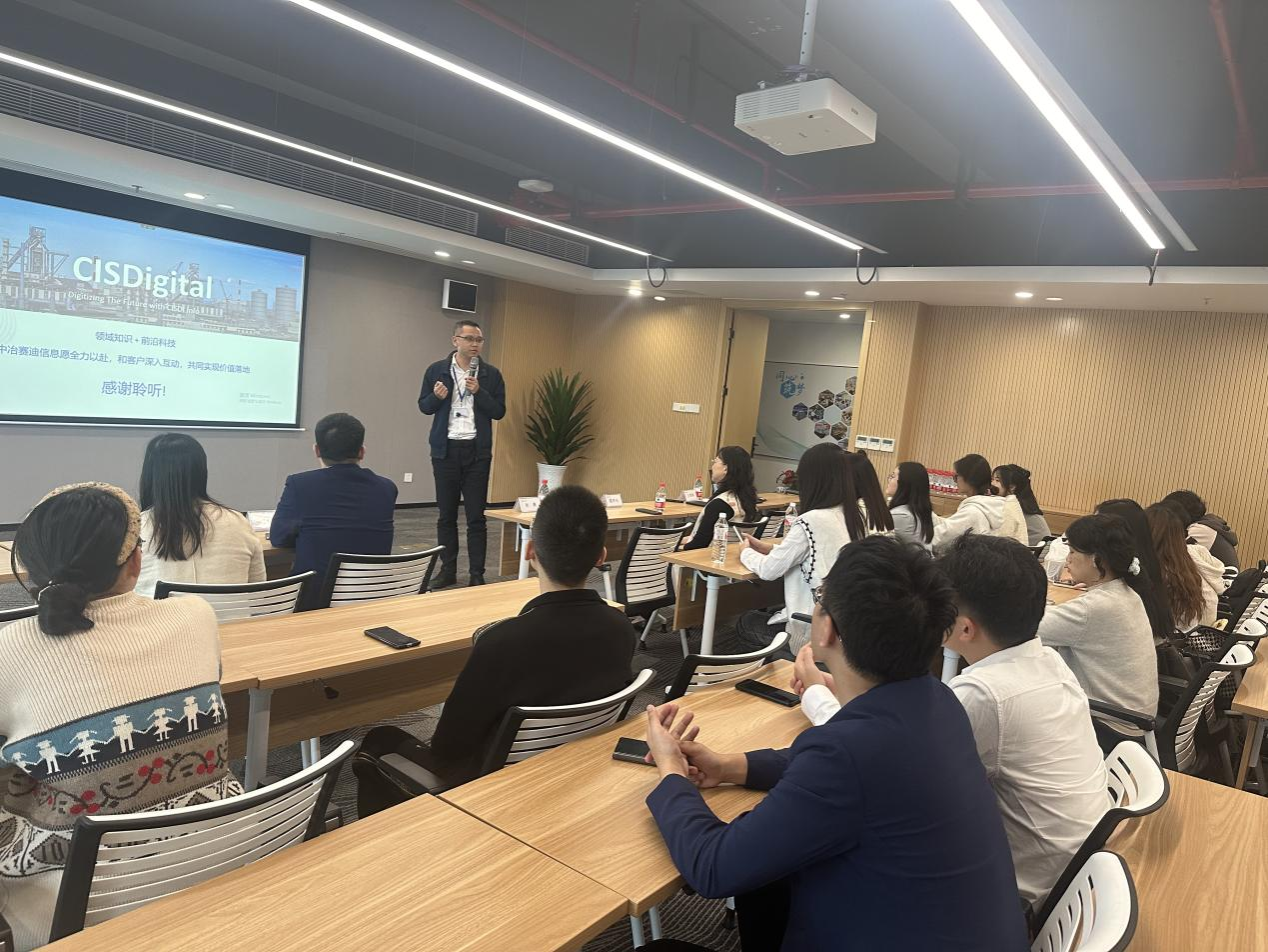 首先,在带队老师的引领下同学们进入了公司展厅,映入眼帘的是中冶赛迪公司的信息化显示屏,详细记录了中冶赛迪进行数字化转型的奋斗历程以及取得的卓越成效。在公司王雪颖老师的讲解下,同学们了解了公司的发展经历、业务板块、科技创新、核心优势以及荣誉资质等。