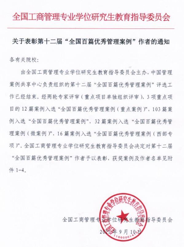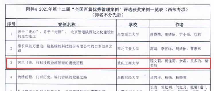 8月30-31日,由全国工商管理专业学位研究生教育指导委员会、中国管理案例共享中心联合发布了第十二届“全国百篇优秀管理案例”的获奖名单,由k1体育程文莉教授及其团队案例开发萃取产生的《苦尽甘来,RT科技现金流管理的漫漫征程》入选“全国百篇优秀管理案例”(西部专项)。