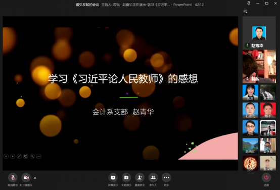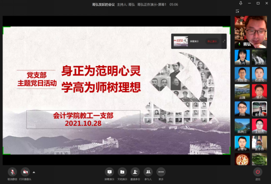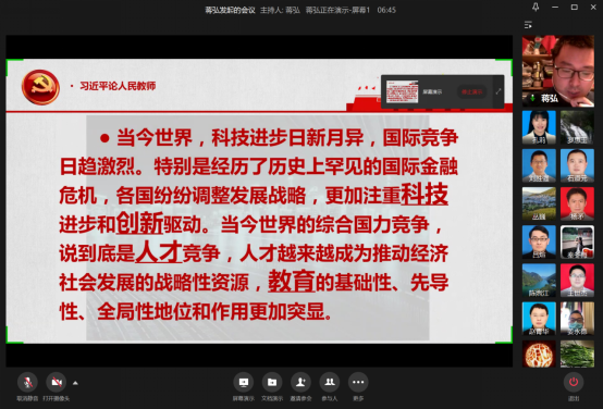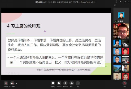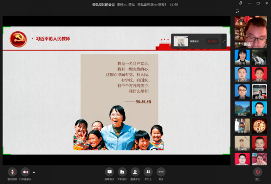 10月28日晚,k1体育教工一支部通过企业微信视频会议召开了“身正为范明心灵,学高为师树理想”主题党日活动。党的十八大以来,习近平总书记高度重视教师工作,发表了许多对人民教师的寄语。教育部教师工作司和“学习强国”学习平台把这些寄语汇编在一起,形成了“习近平论人民教师”的文章。本次活动就旨在通过学习该文章,全面领会习总书记对人民教师的深情关怀、对教育改革的殷切期望,让党员同志立足本职工作做好总结、反思和改进。活动由支部书记蒋弘主持,支部全体党员参加。