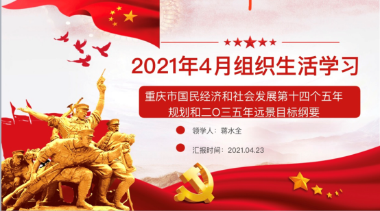 接着,教工二支部书记蒋水全领学了《重庆市十四五规划和二零三五年远景目标》。 蒋水全以重庆市“十三五”规划收官的七大成就开始,讲述了“十四五”时期重庆市的经济社会发展的主要目标,并从十一个抓手、十项工作、两大方面来详细解读了重庆市十四五规划和2035远景目标。蒋书记深入浅出,详简结合,使与会党员对重庆市的十四五规划和二零三五年远景目标有了更深入的了解,对重庆的未来发展也更加充满了信心。