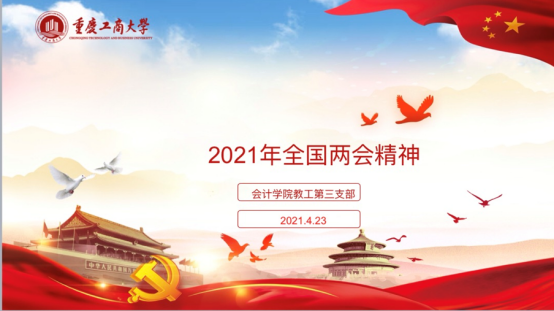 然后,教工三支部书记石恒贵领学了2021年全国两会精神。他从2021年全国两会基本情况介绍、解读2021全国两会重点内容、政府工作报告信号三个方面较为全面地解读了2021年全国两会的精神。在解读2021全国两会重点内容时,石恒贵回顾了过去五年的历史成就,列举了2020年的成绩单,在“十四五”主要目标部分重点从保持宏观政策连续性稳定性可持续性、深入推进重点领域改革、依靠创新推动实体经济高质量发展等八个方面进行了详细解读。