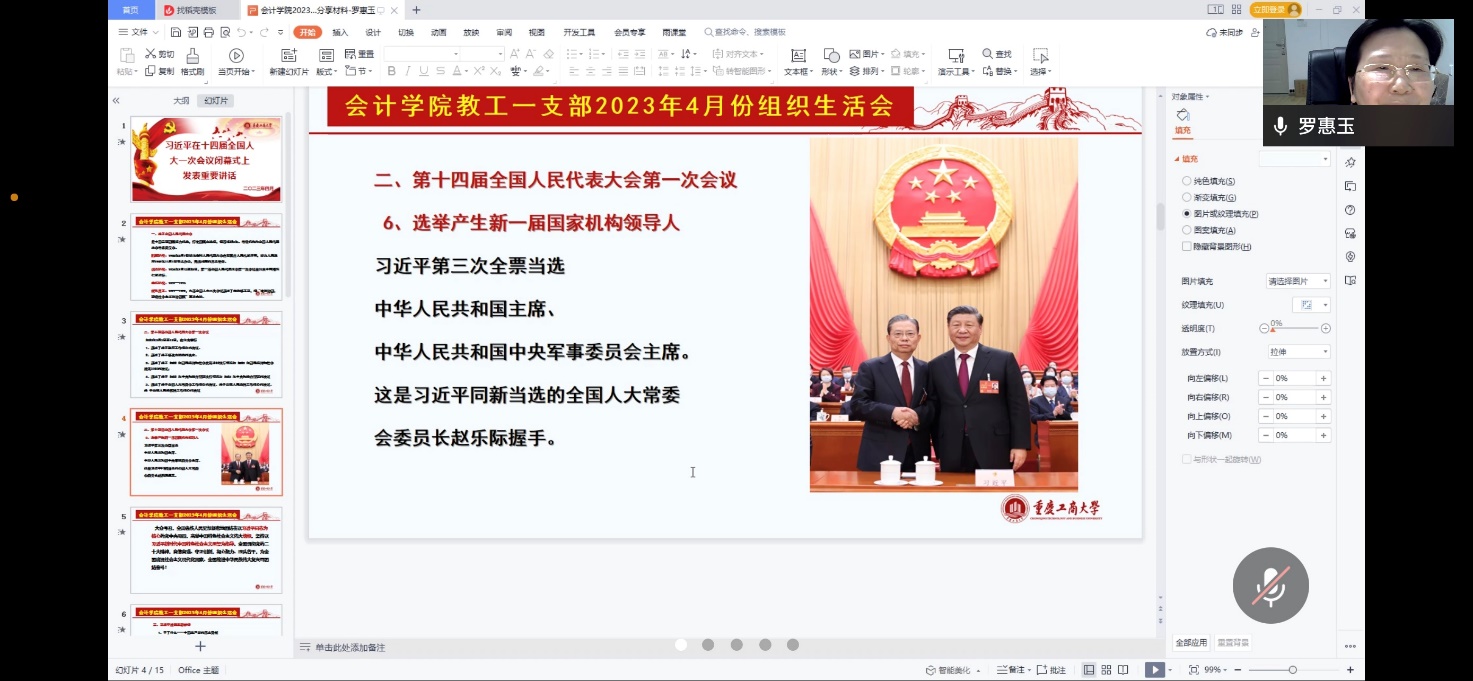 活动一开始,罗惠玉同志带领大家学习了“习近平在十四届全国人大一次会议闭幕式上的重要讲话精神”。她以全国人民代表大会的历史发展作引,讲到第十四届全国人民代表大会第一次会议的内容,然后从“中国共产党的历史贡献”“现阶段的中心任务”“坚定不移推动高质量发展”“始终坚持人民至上”“安全与稳定”“港澳台地区”“和平、发展、合作、共赢”“执政党的自身建设”“只争朝夕,攻坚克难”等九个方面,条理分明地展开对习总书记讲话精神的生动解读。她在领学时强调,全体党员要紧密团结在以习近平同志为核心的党中央周围,坚持以习近平新时代中国特色社会主义思想作为各项工作的指导。