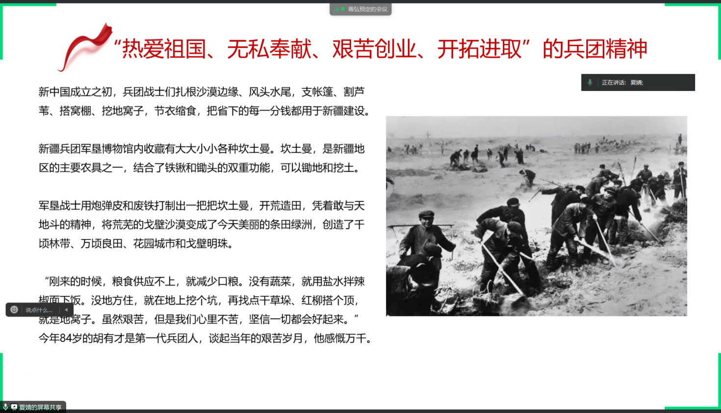 活动第二部分,夏婧发表了学习感想,她以自己去新疆兵团军垦博物馆的参观经历为引,给大家讲述了兵团战士们感人的军垦故事,用“热爱祖国、无私奉献、艰苦创业、开拓进取”的兵团精神让我们体会到了中国人的自信、自强、自立,党员同志们都深受触动。