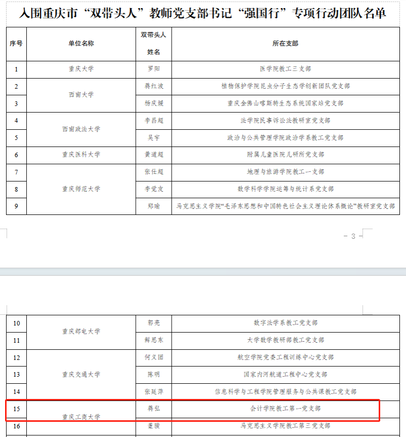 近日,中共重庆市委教育工作委员会公布了重庆市“双带头人”教师党支部书记“强国行”专项行动团队名单,公司教工第一党支部成功入选(“双带头人”教师党支部书记蒋弘)。