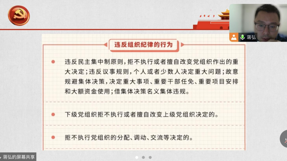 活动一开始,支部书记蒋弘首先带领大家学习了《中国共产党纪律处分条例》分则中的“组织纪律”相关内容。然后,他对习近平总书记近日对学校思政课建设作出的重要指示进行了阐述。蒋弘指出,中国的明天寄托在中国的青年身上,思政教育就是在给广大青年学子种下信仰的种子,让他们在正确“三观”的引导下去追求卓越,为中国的未来而奋斗,其重要性和必要性不言而喻。接着,他以微党课《冷和热》说明信仰所具有的强大力量,鼓励党员同志们要充满信心,因为共产党员的信心之源就是马克思主义信仰,而这一信仰的正确性在人类的历史中已经得到了证明。
