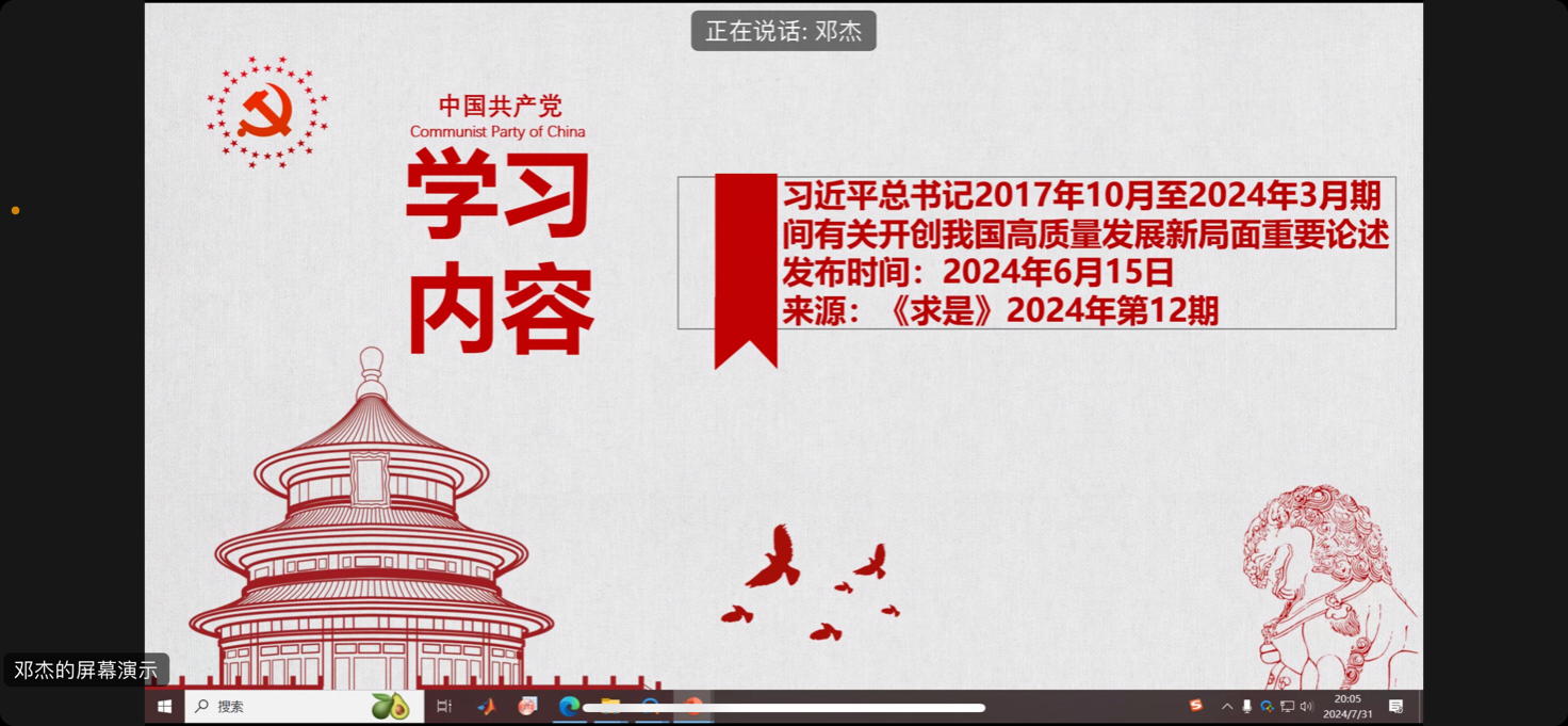 2024年7月31日,k1体育教工一支部组织开展了题为“质量为先谋新篇,创新驱动促发展”的主题党日活动。活动由纪律委员邓杰同志领学,重点学习了习近平总书记重要文章《开创我国高质量发展新局面》。