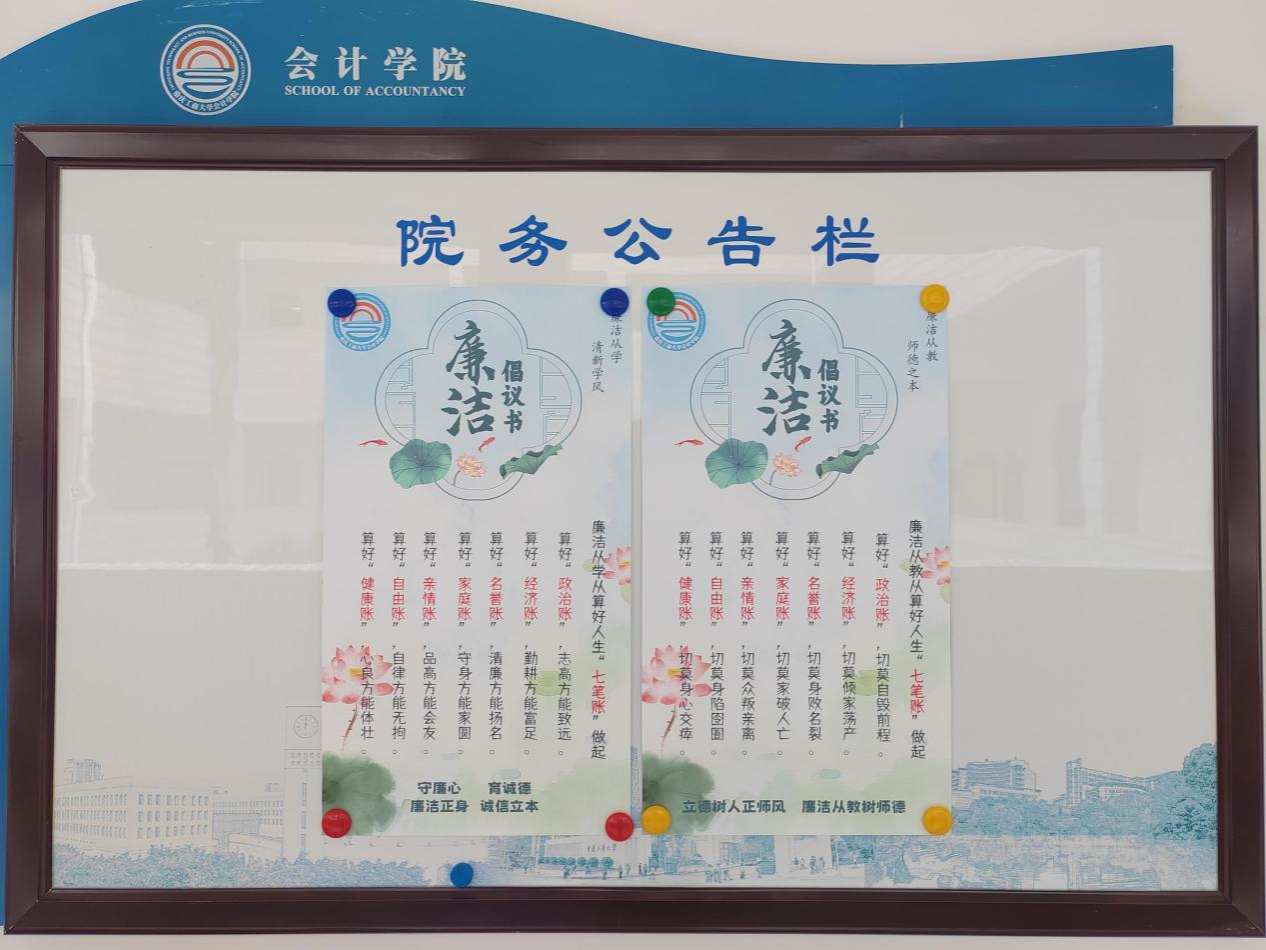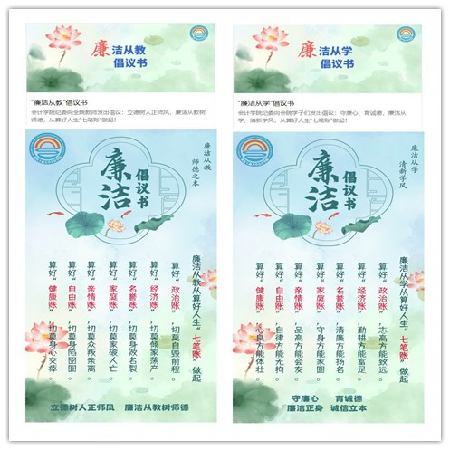 倡议书基于会计“记账”的工作特色,以算好政治账、经济账、名誉账、家庭账、亲情账、自由账和健康账等人生“七笔账”为主要内容,分别针对教师和员工发出,有力督促全院师生坚定“三不腐”原则,增强政治定力、纪律定力、道德定力和抵腐定力,清白做人、清廉做事,始终做到忠诚干净担当。
